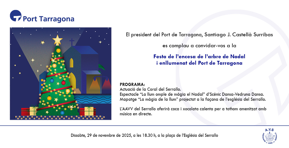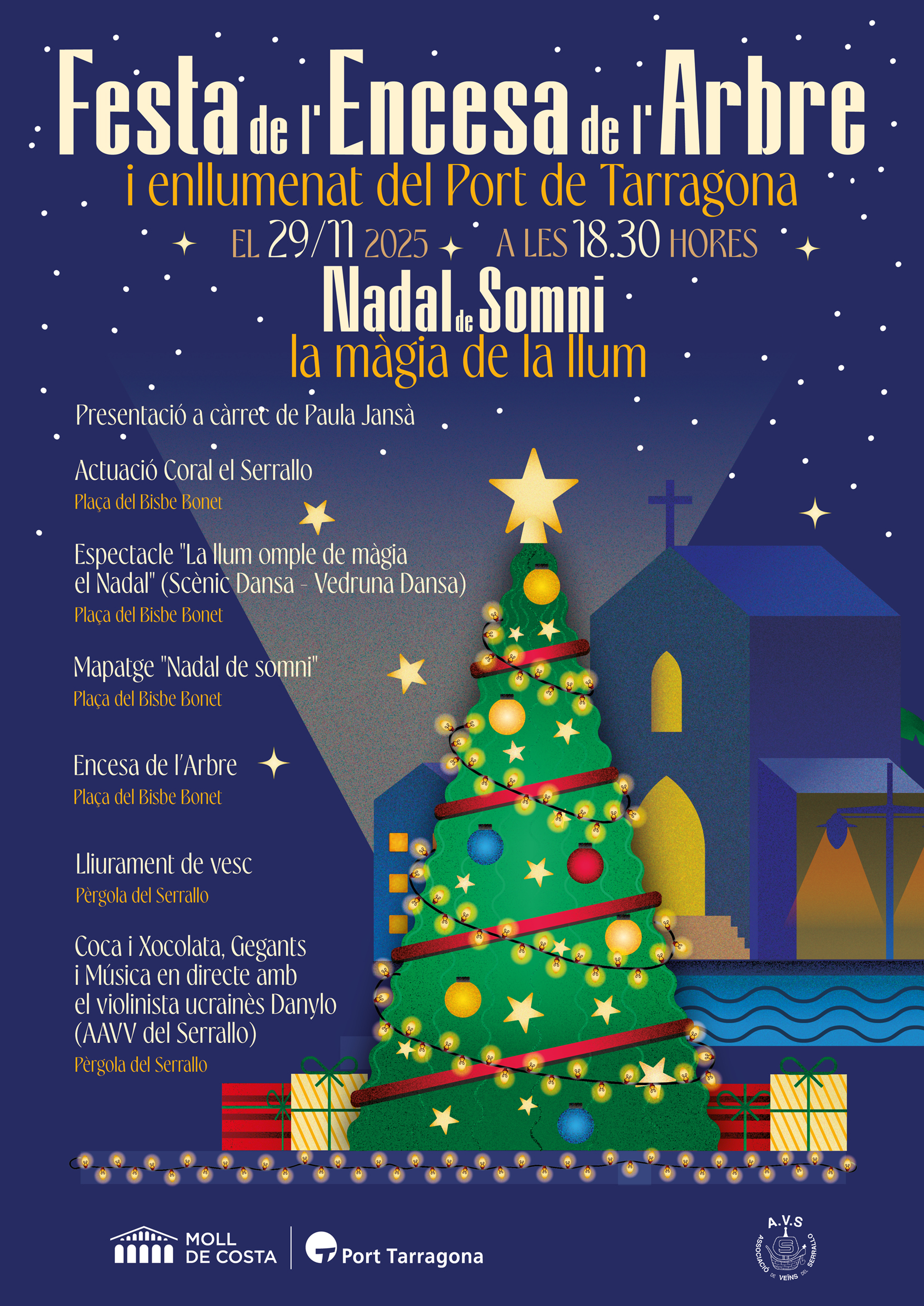 El Port de Tarragona i l'Associació del Veïnat del Serrallo us conviden a aquesta festa on hi participaran els gegants i la coral del Serrallo. També gaudirem de l'espectacle "La llum omple de màgia el Nadal" d'Scènic Dansa-Vedruna. Igualment podrem visionar el mapatge "La màgia de la llum" projectat a la façana de l'església del Serrallo.
