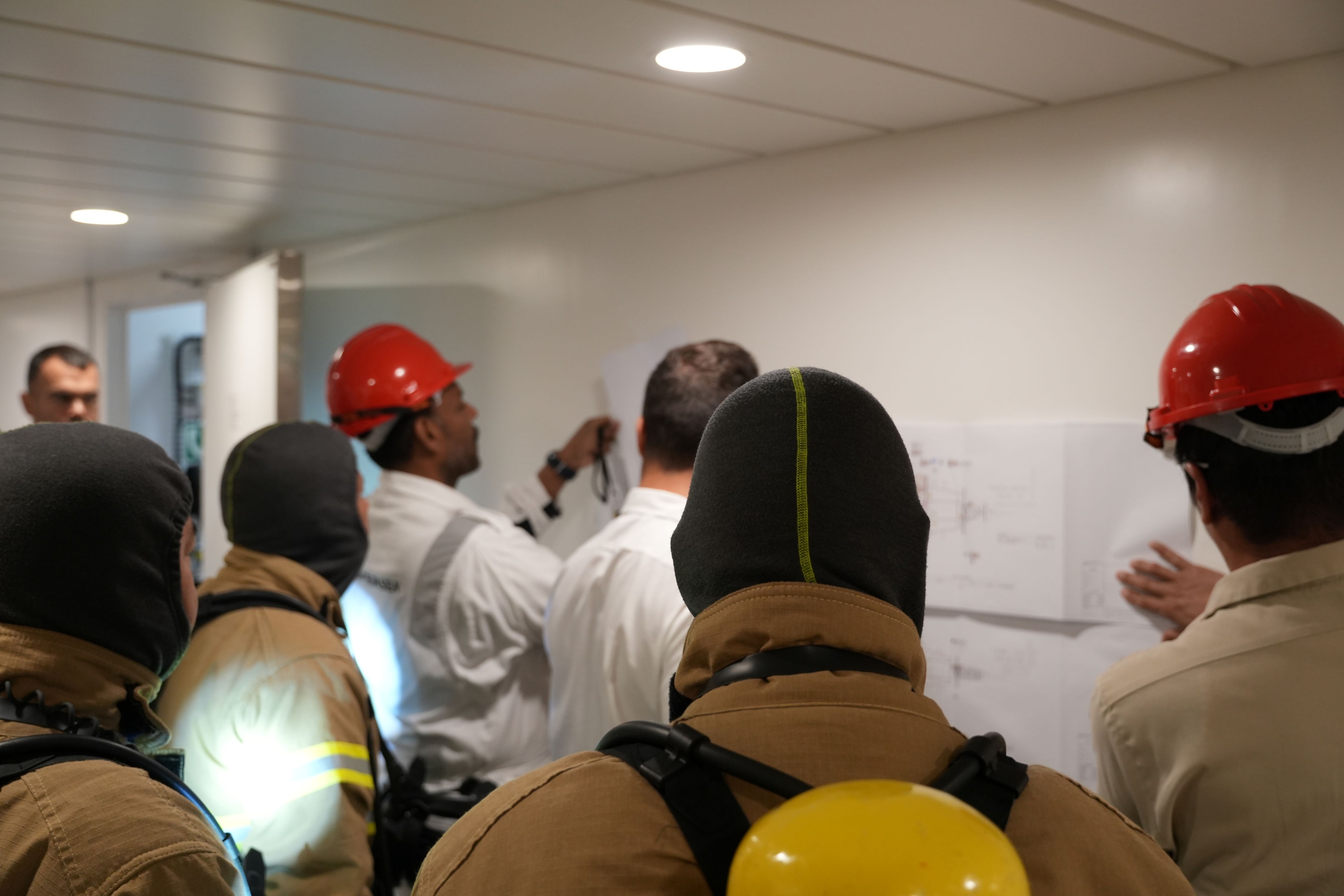 En el vaixell, s’ha establert una zona segura a la coberta 2 des de la qual s’ha dut a terme la coordinació de tots els equips d’emergències que han accedit a l’interior per a realitzar el simulacre. En arribar a la suposada zona zero de l’incident, els equips d’intervenció han confirmat, en primer lloc, que l’accident simulat era un incendi. El personal d’emergències també ha confirmat que hi havia dues persones afectades i que una de les quals havia de ser rescatada per Bombers de la Generalitat mitjançant un sistema d’extracció vertical. Un cop la víctima ha estat fora a la zona perill, s’ha portat a la zona segura per a ser atesa pel personal mèdic.