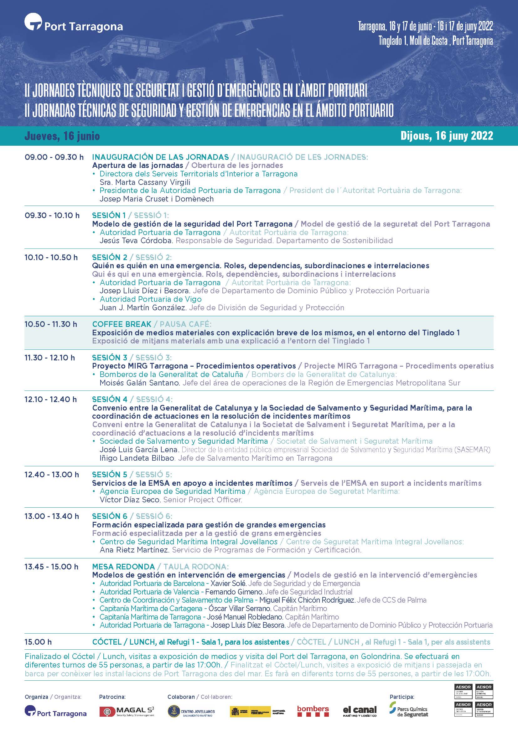 El compromís amb la seguretat i la resposta eficient davant de possibles emergències, forma part de l'estratègia de gestió del Port de Tarragona. El nostre model de gestió i coordinació entre els diferents actuants en aquest tipus de situacions és un referent i per aprofundir-hi, programem els propers 16 i 17 de juny les II Jornades Tècniques de Seguretat en l'àmbit marítim i portuari, reprenent les realitzades a la primera edició del 2019.