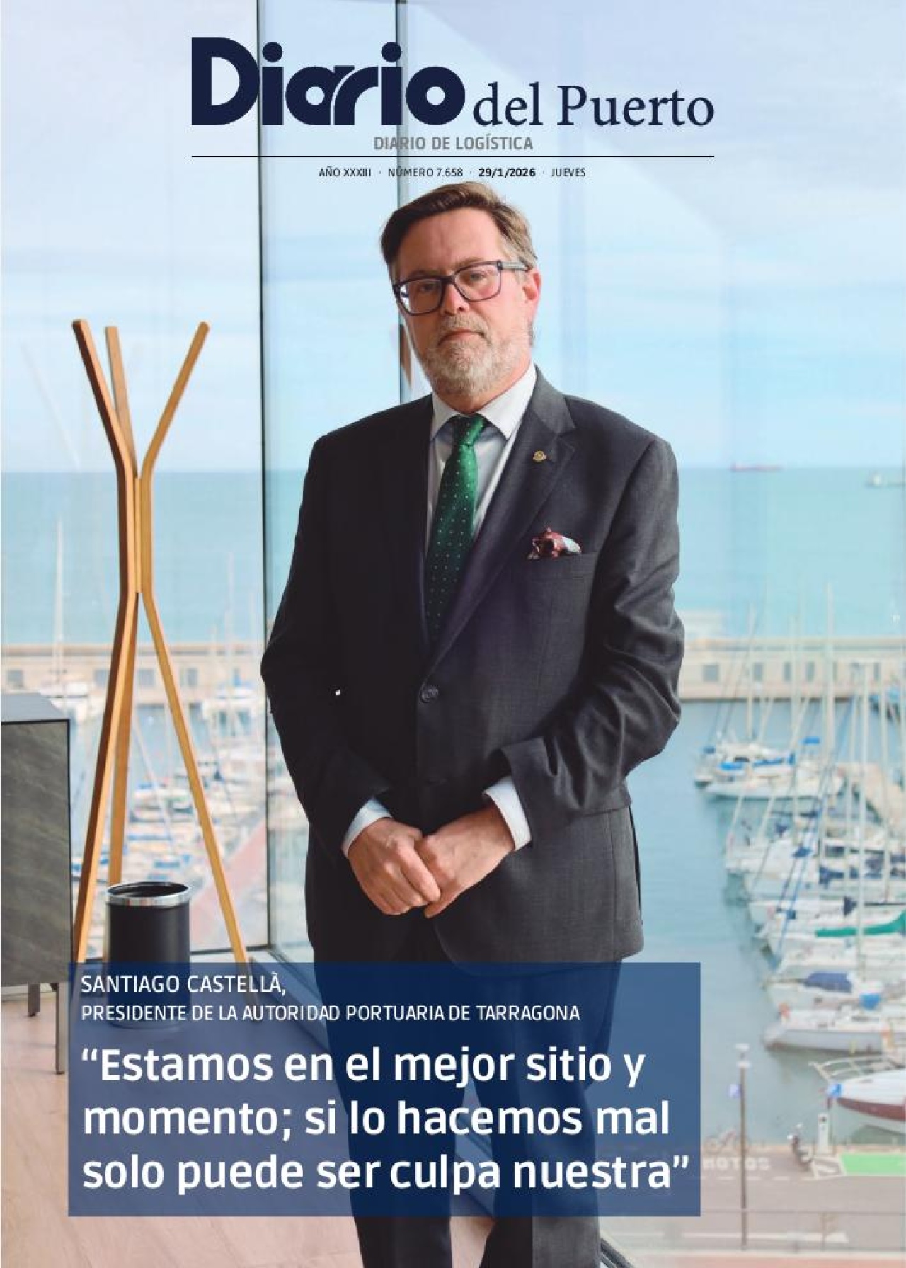 El president de Port Tarragona, Santiago J. Castellà, ha donat a conèixer quines són les principals línies estratègiques en les quals està treballant l’Autoritat Portuària en una entrevista a ‘Diario del Puerto’. Aquesta capçalera, líder entre les publicacions especialitzades en logística i sector portuari, ha dedicat la portada i les pàgines inicials de l’edició d’aquest dijous, 29 de gener, a la conversa que els periodistes Marc Vergés i Jaume Mas han mantingut recentment amb el president Castellà.