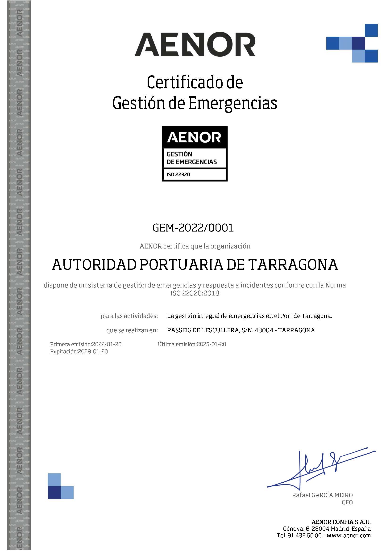 La renovación de la certificación ISO 22320:2018 hasta el 2028 refuerza el liderazgo del Port de Tarragona en seguridad e innovación. La APT ha estado pionera en la gestión y coordinación de servicios con diferentes cuerpos de emergencias, la inclusión de nuevas tecnologías como los drones, mientras ya trabaja en un nuevo Plan de Autoprotección.