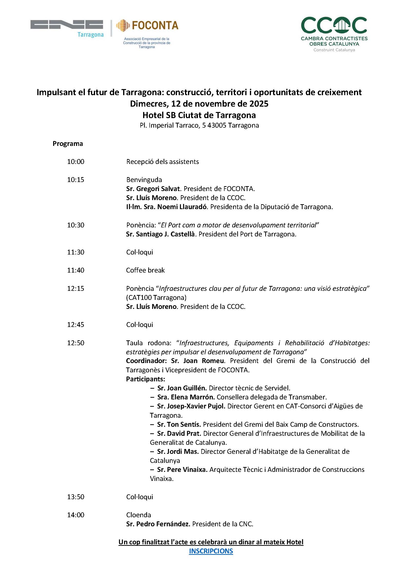 La Cambra de Contractistes d'Obres de Catalunya (CCOC), una convocatòria de premsa per al dimecres, 12 de novembre a l'hotel SB Ciutat de Tarragona (pl. Imperial Tarraco, 5)